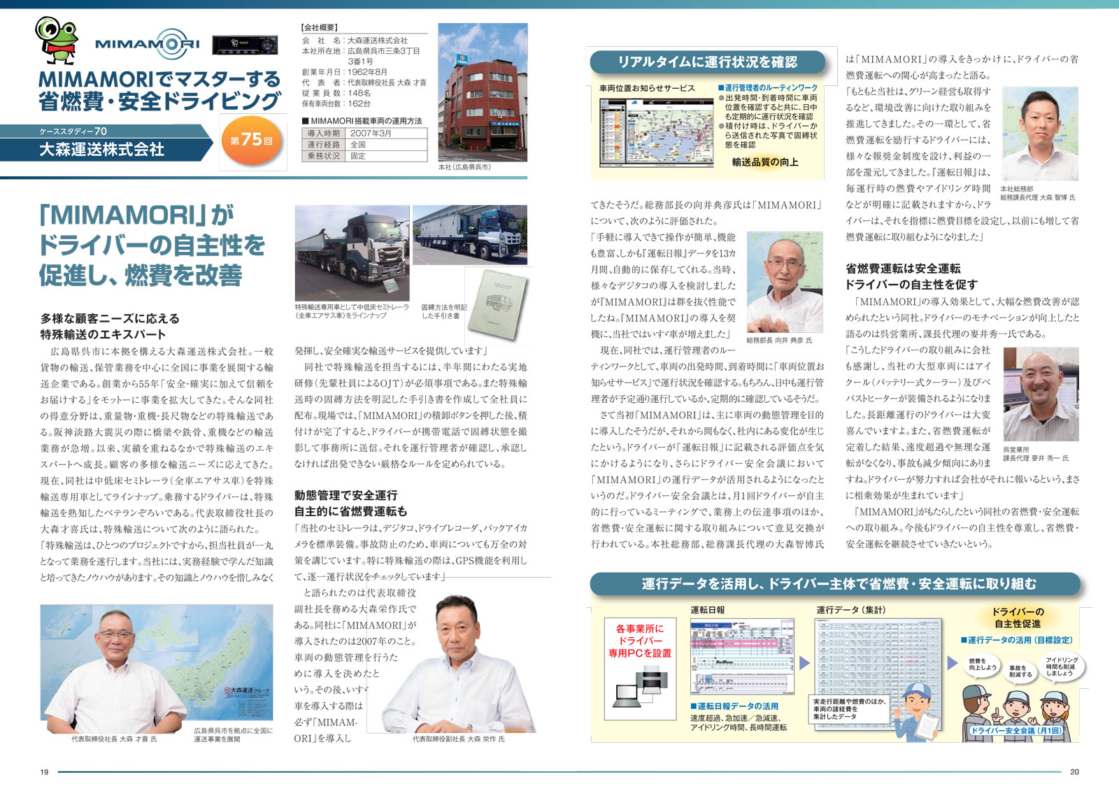 「当社のセミトレーラは、デジタコ、ドライブレコーダ、バックアイカメラを標準装備。事故防止のため、車両についても万全の対策を講じています。特に特殊輸送の際は、GPS機能を利用して、逐一運行状況をチェックしています」と語られたのは代表取締役副社長を務める大森栄作氏である。同社に「MIMAMORI」が導入されたのは2007年のこと。車両の動態管理を行うために導入を決めたという。その後、いすゞ車を導入する際は必ず「MIMAMORI」を導入してきたそうだ。総務部長の向井典彦氏は「MIMAMORI」について、次のように評価された。「手軽に導入できて操作が簡単、機能も豊富、しかも『運転日報』データを13カ月間、自動的に保存してくれる。当時、様々なデジタコの導入を検討しましたが『MIMAMORI』は群を抜く性能でしたね。『MIMAMORI 』の導入を契機に、当社ではいすゞ車が増えました」現在、同社では、運行管理者のルーティンワークとして、車両の出発時間、到着時間に「車両位置お知らせサービス」で運行状況を確認する。もちろん、日中も運行管理者が予定通り運行しているか、定期的に確認しているそうだ。さて当初「MIMAMORI」は、主に車両の動態管理を目的に導入したそうだが、それから間もなく、社内にある変化が生じたという。ドライバーが「運転日報」に記載される評価点を気にかけるようになり、さらにドライバー安全会議において「MIMAMORI」の運行データが活用されるようになったというのだ。ドライバー安全会議とは、月1回ドライバーが自主的に行っているミーティングで、業務上の伝達事項のほか、省燃費・安全運転に関する取り組みについて意見交換が行われている。本社総務部、総務課長代理の大森智博氏は「MIMAMORI」の導入をきっかけに、ドライバーの省燃費運転への関心が高まったと語る。「もともと当社は、グリーン経営も取得するなど、環境改善に向けた取り組みを推進してきました。その一環として、省燃費運転を励行するドライバーには、様々な報奨金制度を設け、利益の一部を還元してきました。『運転日報』は、毎運行時の燃費やアイドリング時間などが明確に記載されますから、ドライバーは、それを指標に燃費目標を設定し、以前にも増して省燃費運転に取り組むようになりました」