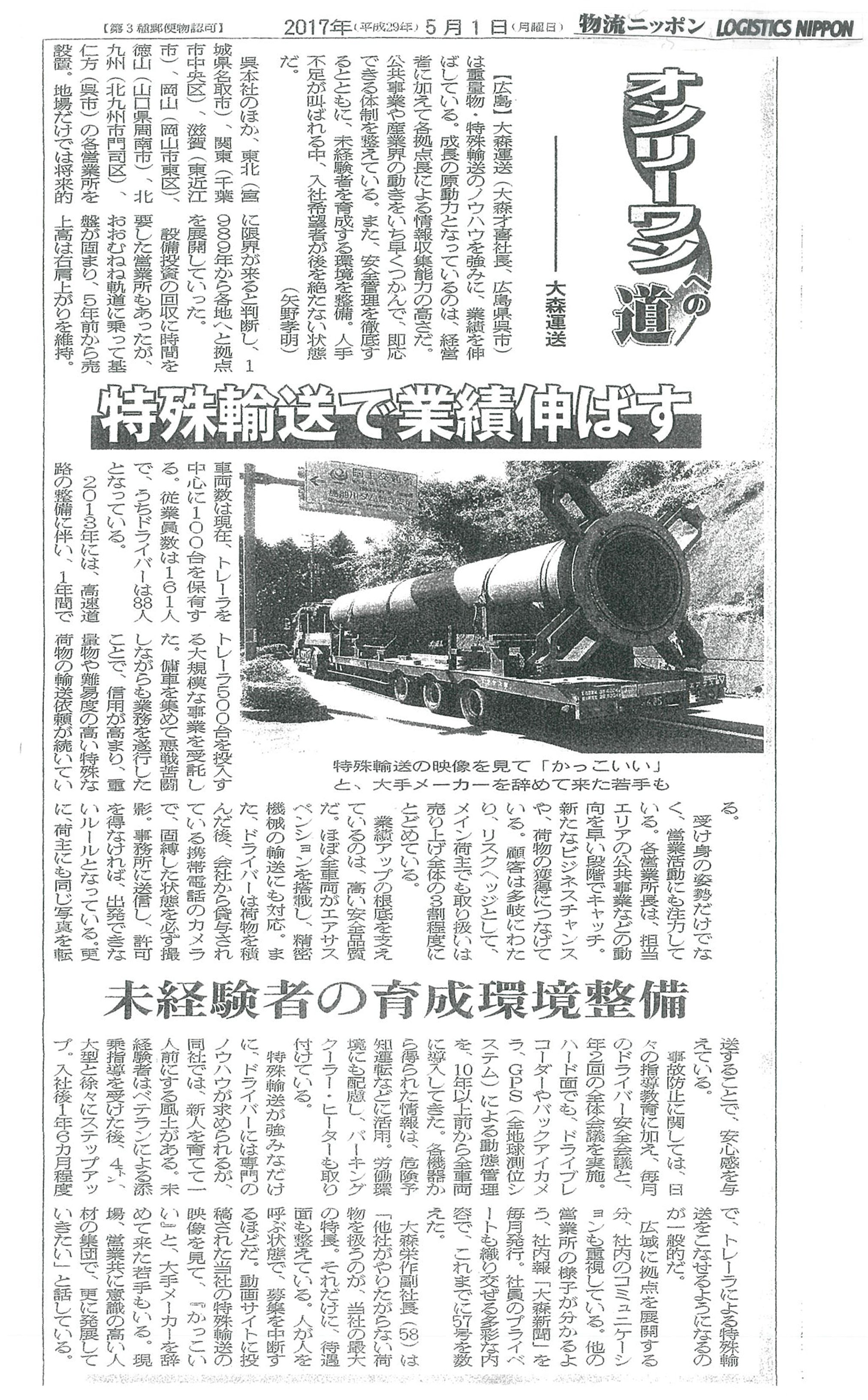 事故防止に関しては、日々の指導教育に加え、毎月のドライバー安全会議と、年2回の全体会議を実施。ハード面でも、ドライブレコーダーやバックアイカメラ、GPS(全地球測位システム)による動態管理を、10年以上前から全車両に導入してきた。各機器から得られた情報は、危険予知運転などに活用。労働環境にも配慮し、パーキングクーラー、ヒーターも取り付けている。特殊輸送が強みなだけに、ドライバーには専門のノウハウが求められるが、同社では、新人を育てて一人前にする風土がある。未経験者はベテランによる添乗指導を受けた後、4トン、大型と徐々にステップアップ。入社後1年6カ月程度で、トレーラによる特殊輸送をこなせるようになるのが一般的だ。広域に拠点を展開する分、社内のコミュニケーションも重視している。他の営業所の様子が分かるよう、社内報「大森新聞」を毎月発行。社員のプライベートも織り交ぜる多彩な内容で、これまでに57号を数えた。大森栄作副社長(58)は「他社がやりたがらない荷物を扱うのが、当社の最大の特長。それだけに、待遇面も整えている。人が人を呼ぶ状態で、募集を中断するほどだ。動画サイトに投稿された当社の特殊輸送の映像を見て、『かっこいい』と、大手メーカーを辞めて来た若手もいる。現場、営業共に意識の高い人材の集団で、更に発展していきたい」と話している。